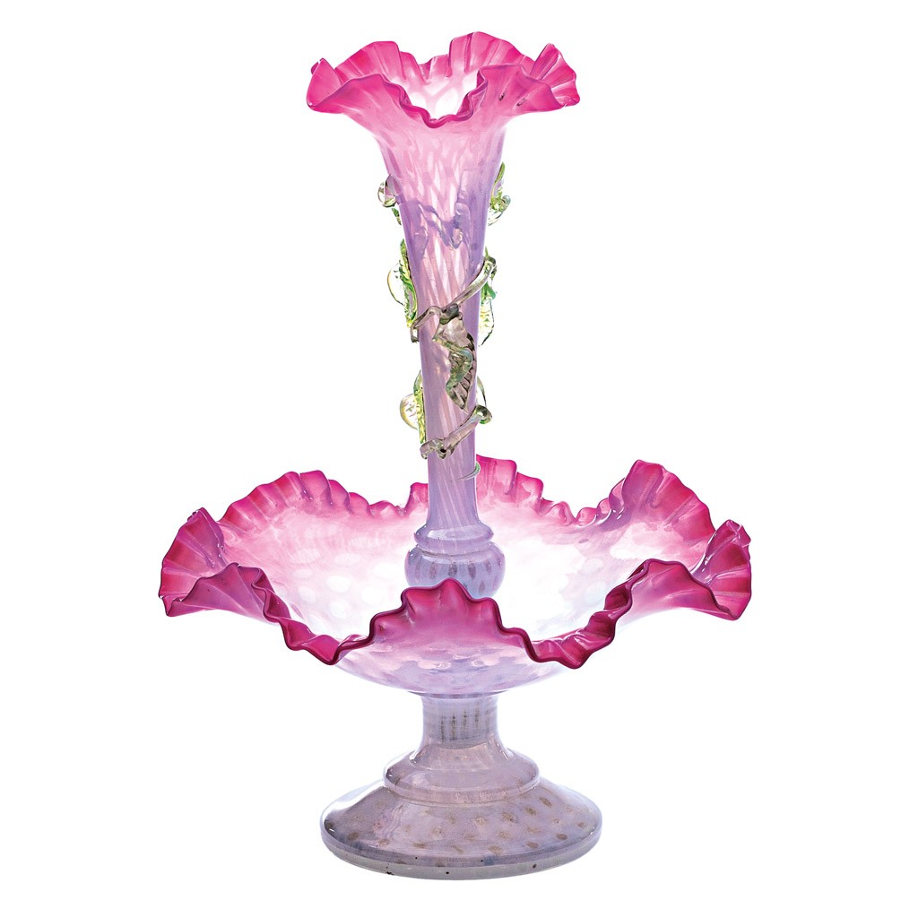 cseh, 19. sz. második fele, többszínű fújt üveg, rátétes díszítéssel, kicsavarozható vázarésszel, m: 40 cm