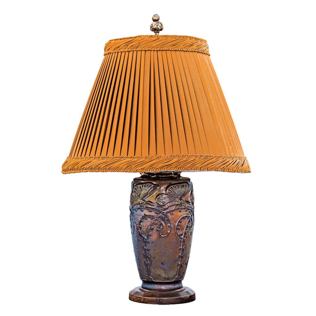 Zsolnay gyár, Pécs, 1910 körül, fémes felülete savmaratott eozinmázas porcelánfajansz, selyem búrával, fa talpon, egyégős szerelékkel, alján Zsolnay jelzés, átfúrva, m: 27 cm; lámpa m: 61 cm