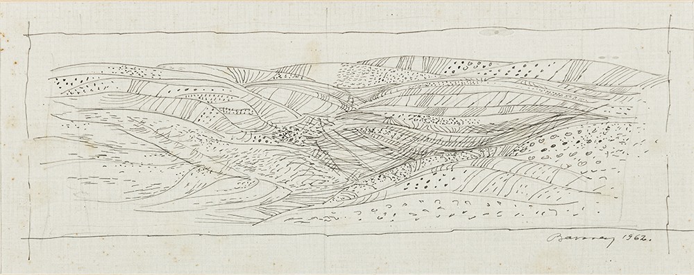 Barcsay Jenő (Katona, 1900 – Budapest, 1988) Dombos tájkép Tus, papír 185 X 282 mm Jelezve jobbra lent: Barcsay 1962
