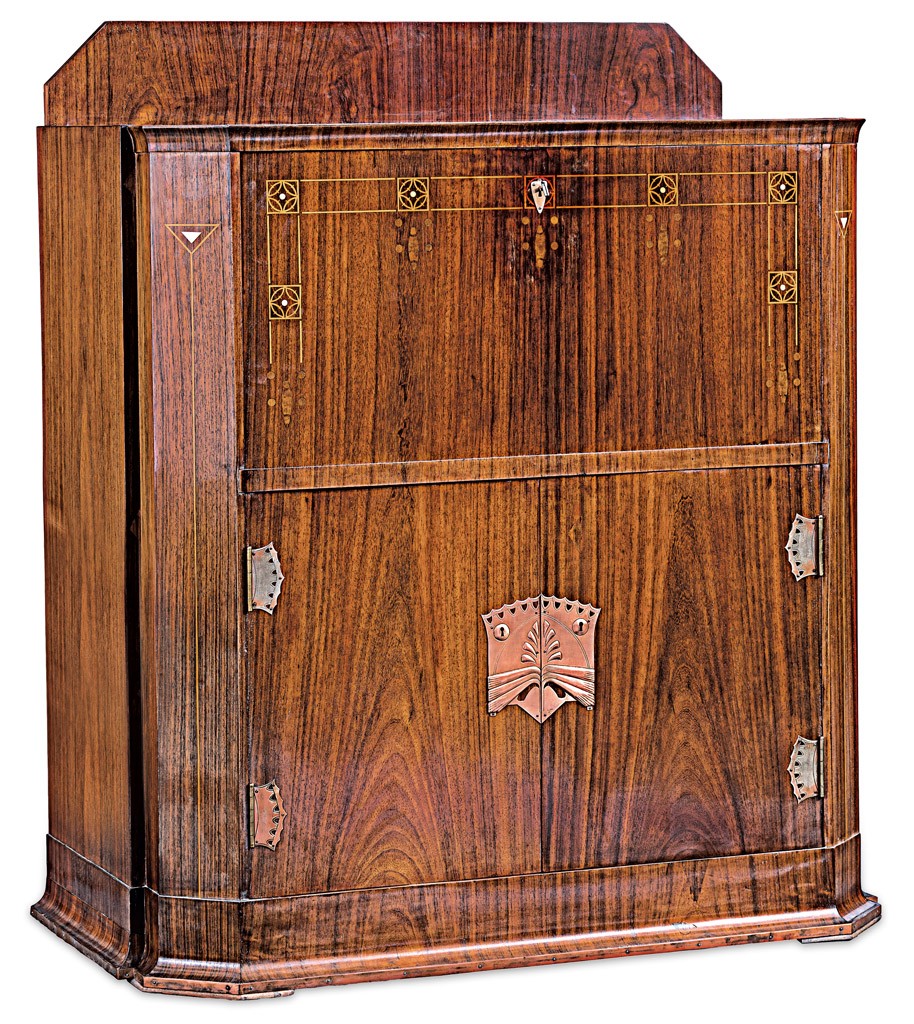 osztrák, 1910 körül, fenyőfa alapon mahagóni borítással, jávorfa és gyöngyház intarziával, tetején márványlappal, domborított vörösréz veretekkel, 1 db kulccsal, 153*128,5*68 cm