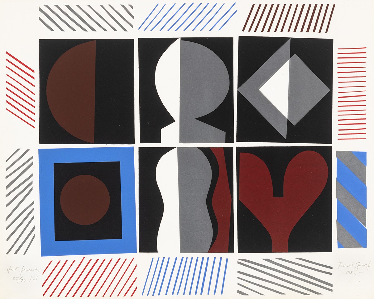 Bartl József (Budapest, 1932 – Budapest, 2013) Hat forma, 1982 Szitanyomat, papír 580 × 700 mm Jelezve balra lent: Hat forma 25/30 Jelezve jobbra lent: Bartl József 1982