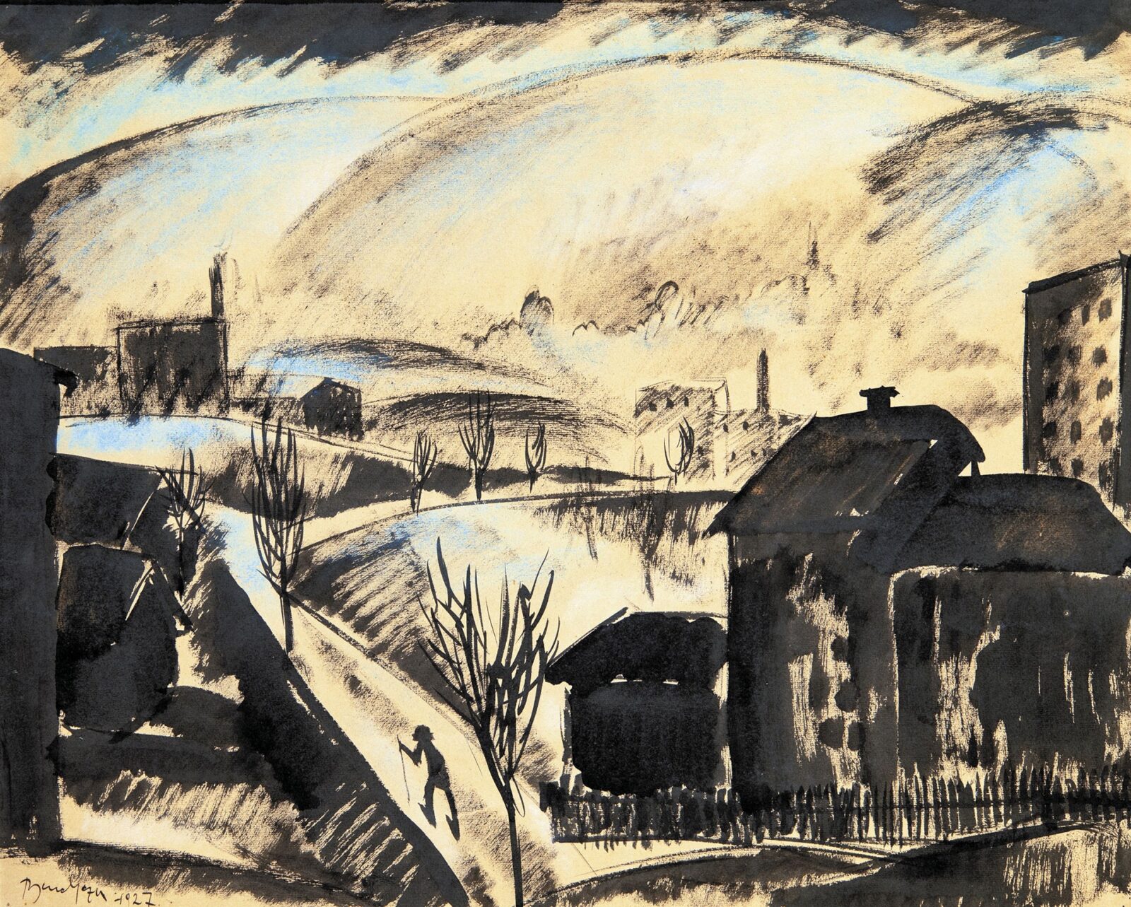 Lavírozott tus, pasztell, papír , 50 x 66 cm, Jelezve balra lent: Bene Géza 1927