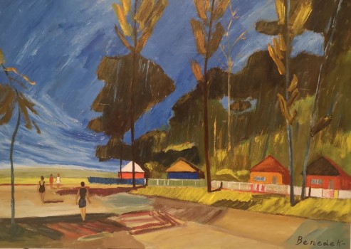 Benedek Jenő, id. (1906-1987) Benedek Jenő, id. (1906-1987): Badacsony. Olaj, farostlemez. Jelzett. Hátoldalán a Képcsarnok Vállalat címkéjével.