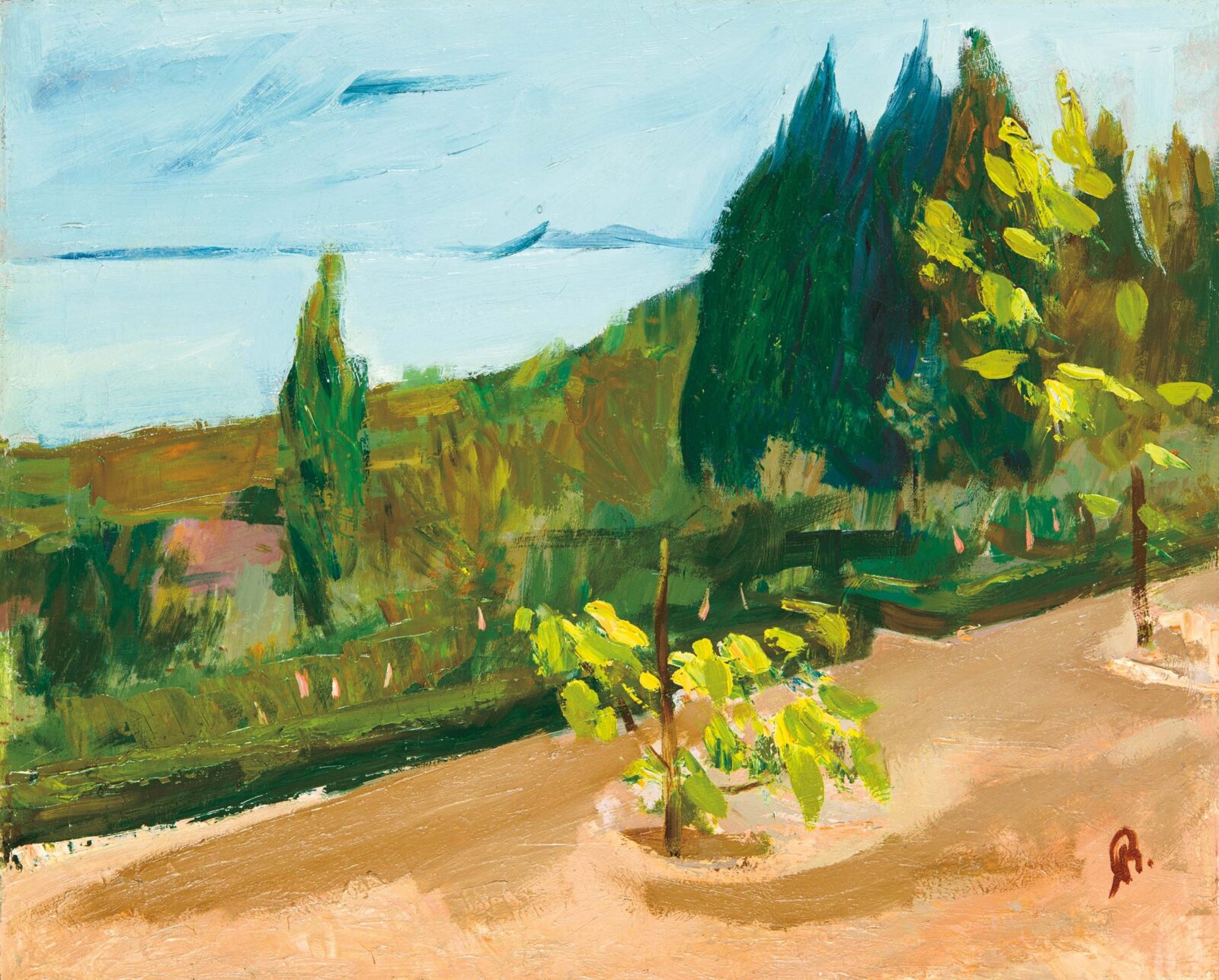 Bernáth Aurél (1895-1982): Balatoni táj tujákkal, Ábrahámhegy, 1955