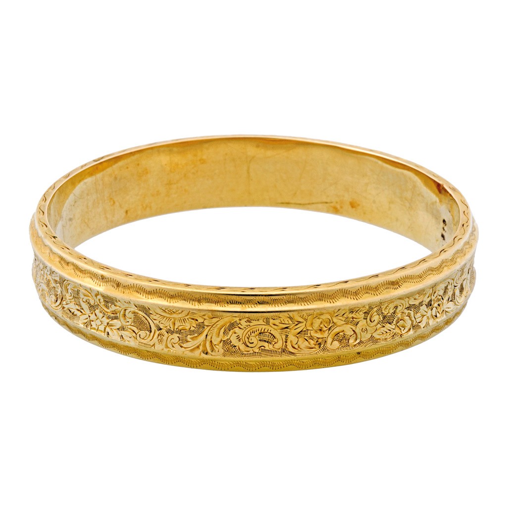 19. sz. vége, bécsi fémjellel ellátva, 14 k arany, "AF" mesterjegy, merev karpánt, körben és oldalain gazdagon vésett, cizellált díszítéssel, apró hibával, 19,6 g