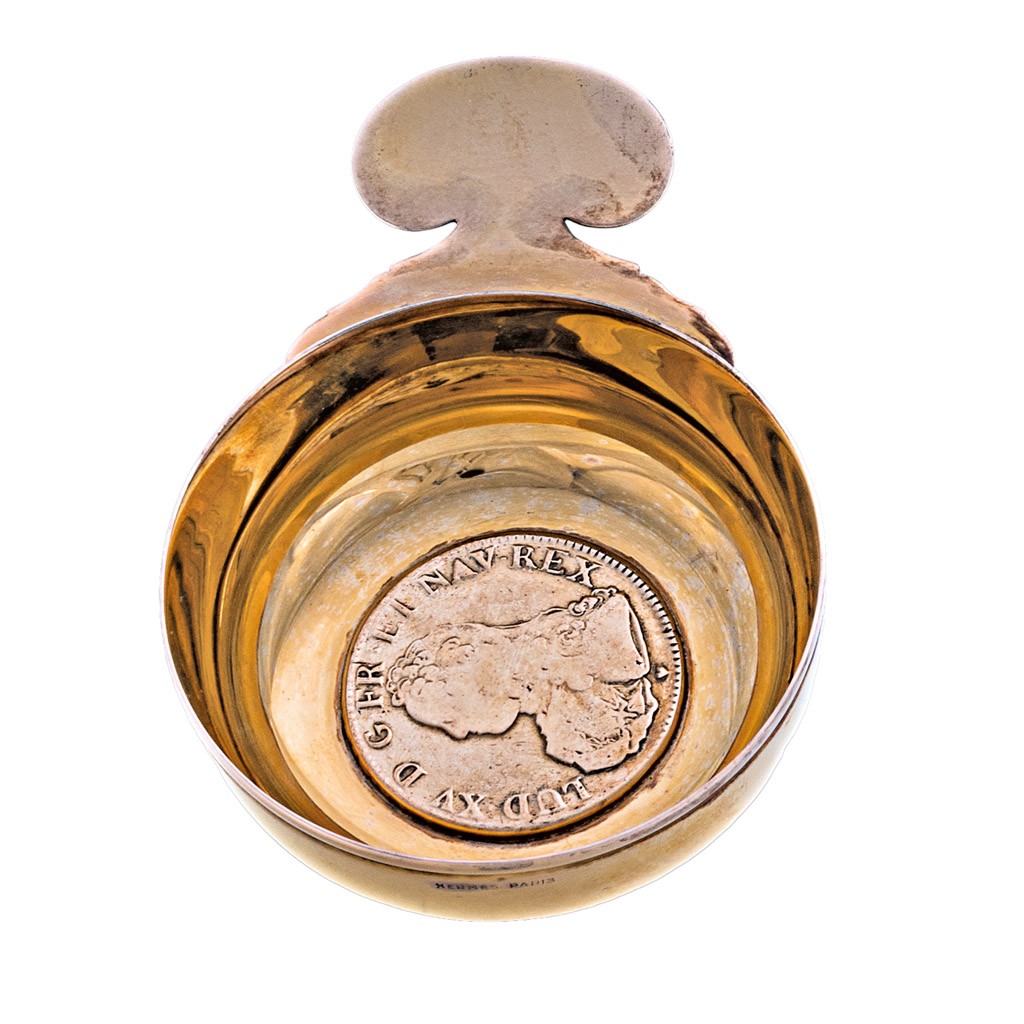 francia, 19. sz., 900 ezrelékes aranyozott ezüst, 1839 utáni fémjellel, beültetett 1726-os XV.Lajos "Sit Nomen Domini Benedictum" feliratú éremmel, oldalában HERMES PARIS beütővel, kissé megkopva, 113 g; 11*8*3,3 cm