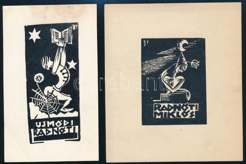 Buday György (1907-1990), 2 db Radnóti Miklós ex libris: Újmódi Radnóti és Radnóti Miklós, linómetszet, papír, jelzett a metszeten, 6×4,5 és 8×3,5 cm