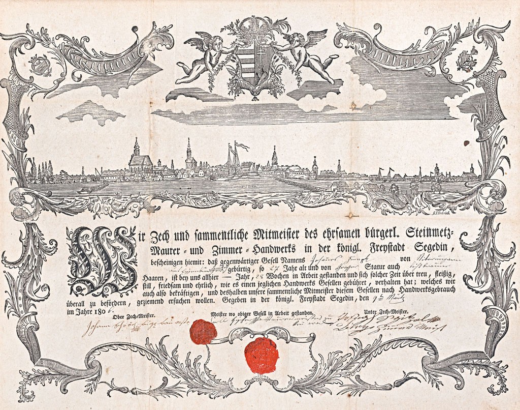 Szeged, 1806, kőműves és ács céh mesterlevele, rézmetszet, papír, Szeged látképével, j.j.l.: f. Hedrich, 39*48 cm