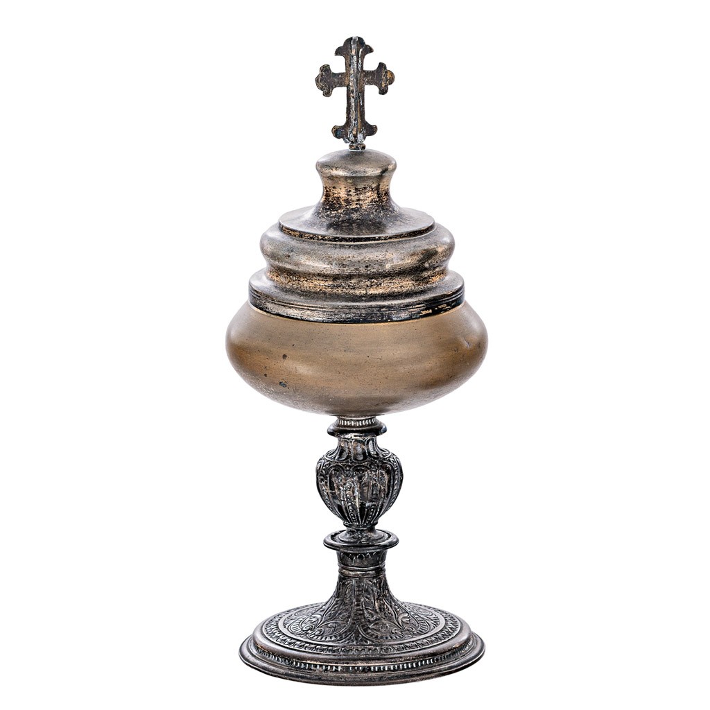 német (?), 19. sz. vége, ezüstözött, aranyozott fém, összeállított tárgy talp és szár reneszánsz motívumokkal díszítve, kis sérüléssel, m: 26 cm