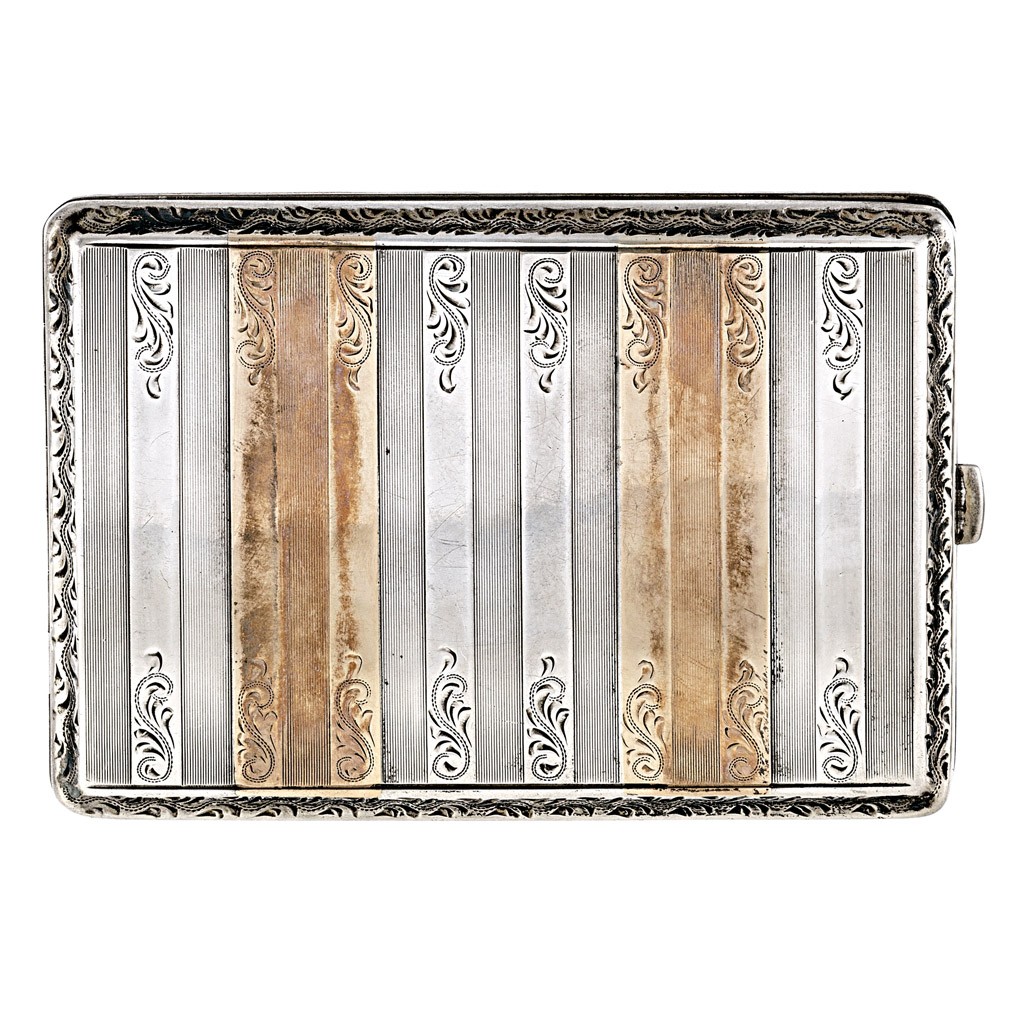 Pest, 1867-1936 közötti fémjel, 750 ezrelékes ezüst, belül és fedlapon aranyozva, Láng Testvérek mesterjegy, csíkozott, vésett sávos díszítéssel, belül 119343 fazonszámmal, 158 g; 12*8*1,4 cm