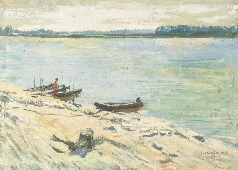 Kikiáltási ár: 360 000 FtÓvári László (Nyíregyháza, 1926 – Budapest, 1988) Balatoni táj Olaj, vászon 60 × 90 cm Jelezve balra lent: Óvári Hátoldalán Képcsarnoki etikett