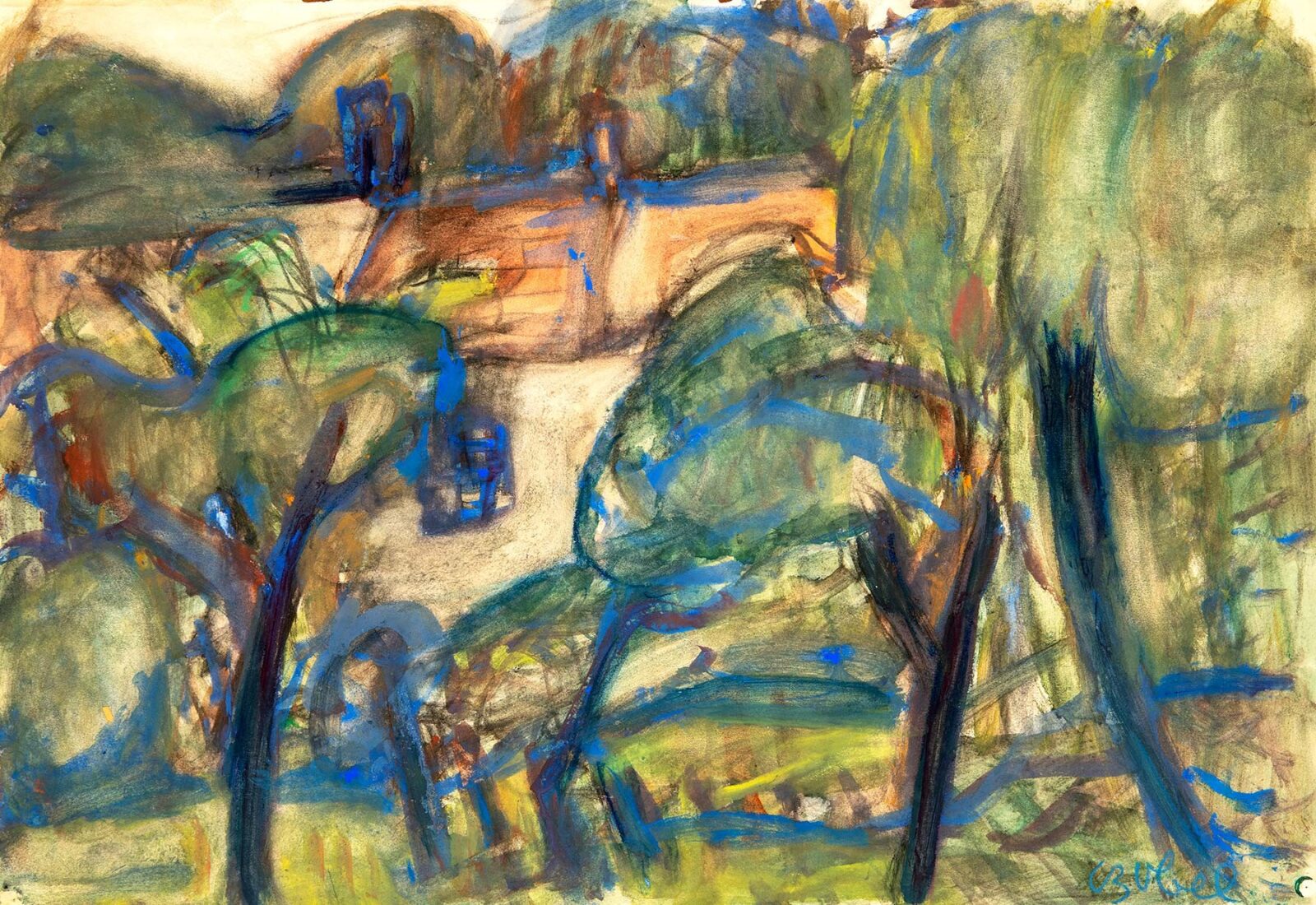 Tempera, pasztell, akvarell, papír, 43,5 x 63,5 cm, Jelezve jobbra lent: Czóbel