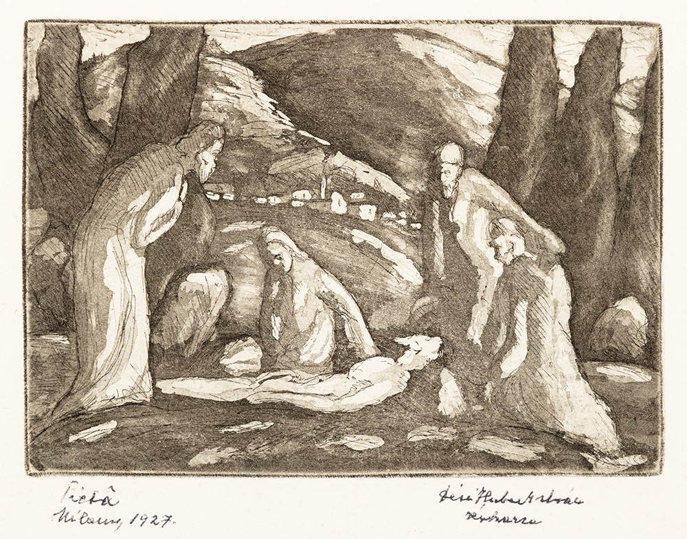 Dési Huber István (Nagyenyed, 1895 – Budapest, 1944) Pieta Rézkarc, papír 96 X 135 mm Jelezve jobbra lent: Dési Huber István rézkarc Jelezve balra lent: Pieta, Milano, 1927