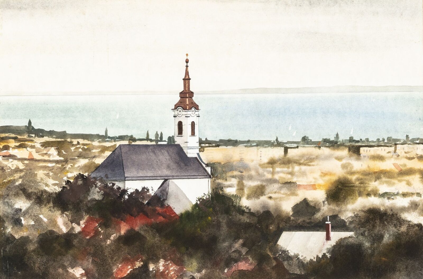Dobroszláv József (Felsőgalla, 1932 – 2016): Balatoni látkép templommal