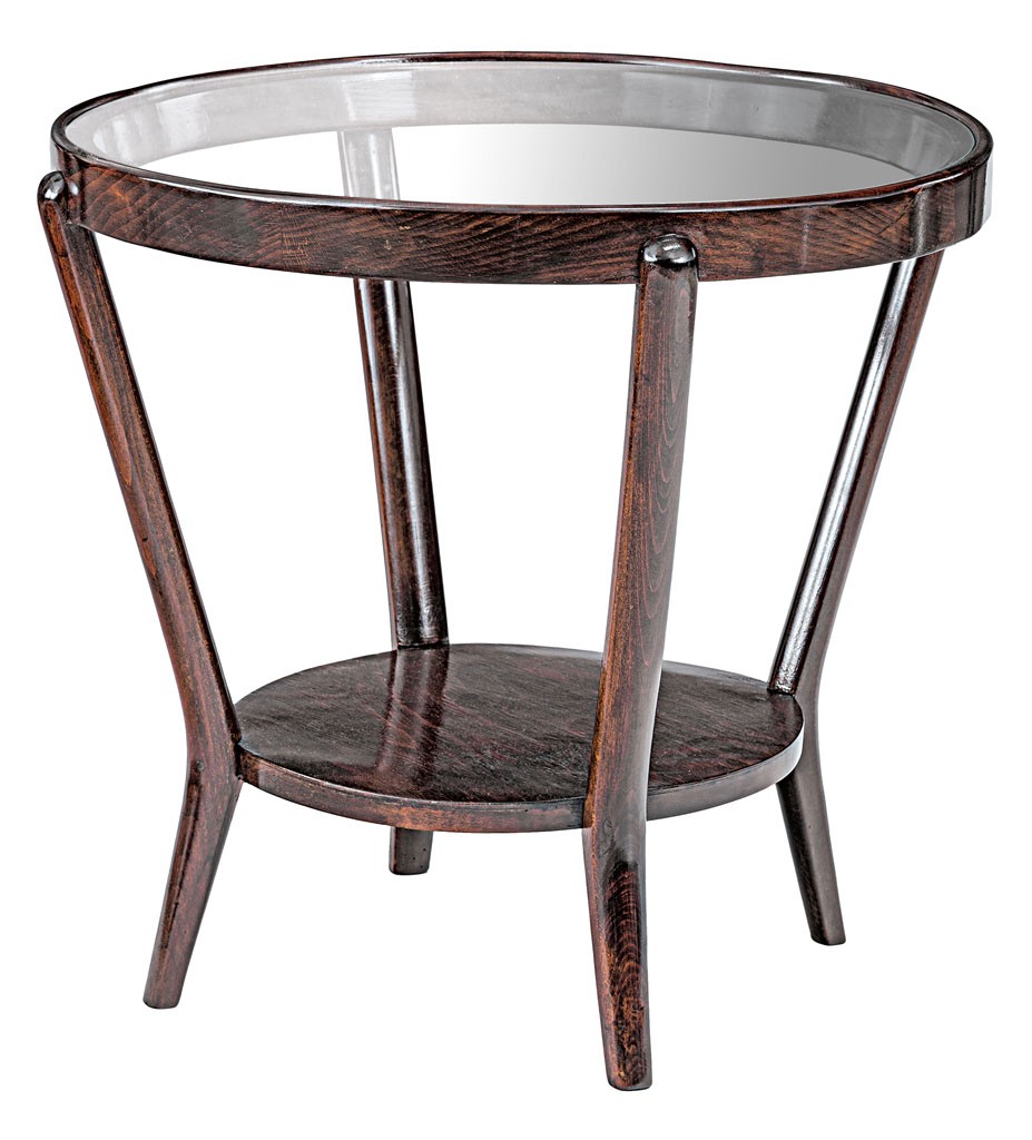 magyar, 1930 körül, mahagóni színűre pácolt bükkfa, tetején üveglappal, felújított, 65*69 cm