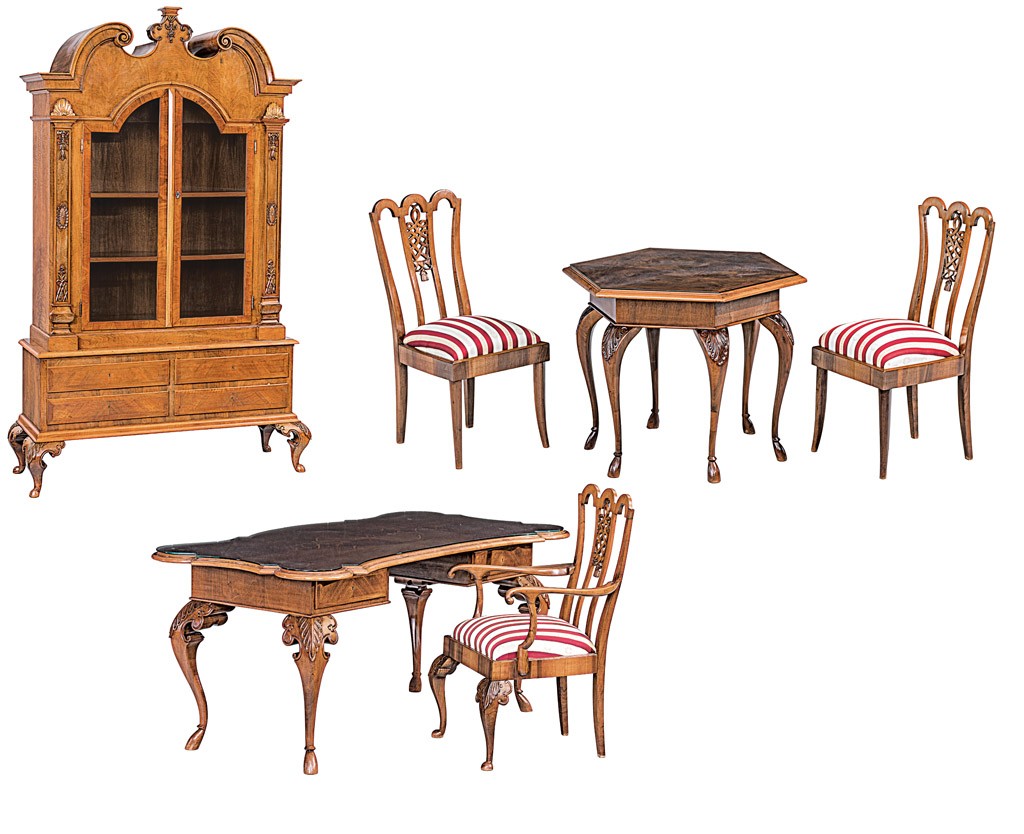 Kozma Lajos, 1920-30 körül, fenyőfa alapon diófa borítással és tömör diófa, faragott díszítéssel, íróasztal tetején intarziás díszítéssel és üveglappal, felújított, támlás szék: 95*46*46 cm, szalonasztal: 71*94*94 cm, könyvszekrény: 226*150*48 cm, íróaszt