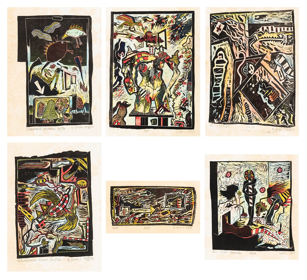 ef. Zámbó István (Salgótarján, 1950) 6 db fametszet, 1974 Fametszet, papír 460 × 330 mm / 330 × 460 mm Jelezve középen lent: 100/94 Jelezve jobbra lent: ef. Zámbó I. 19 EZI 74