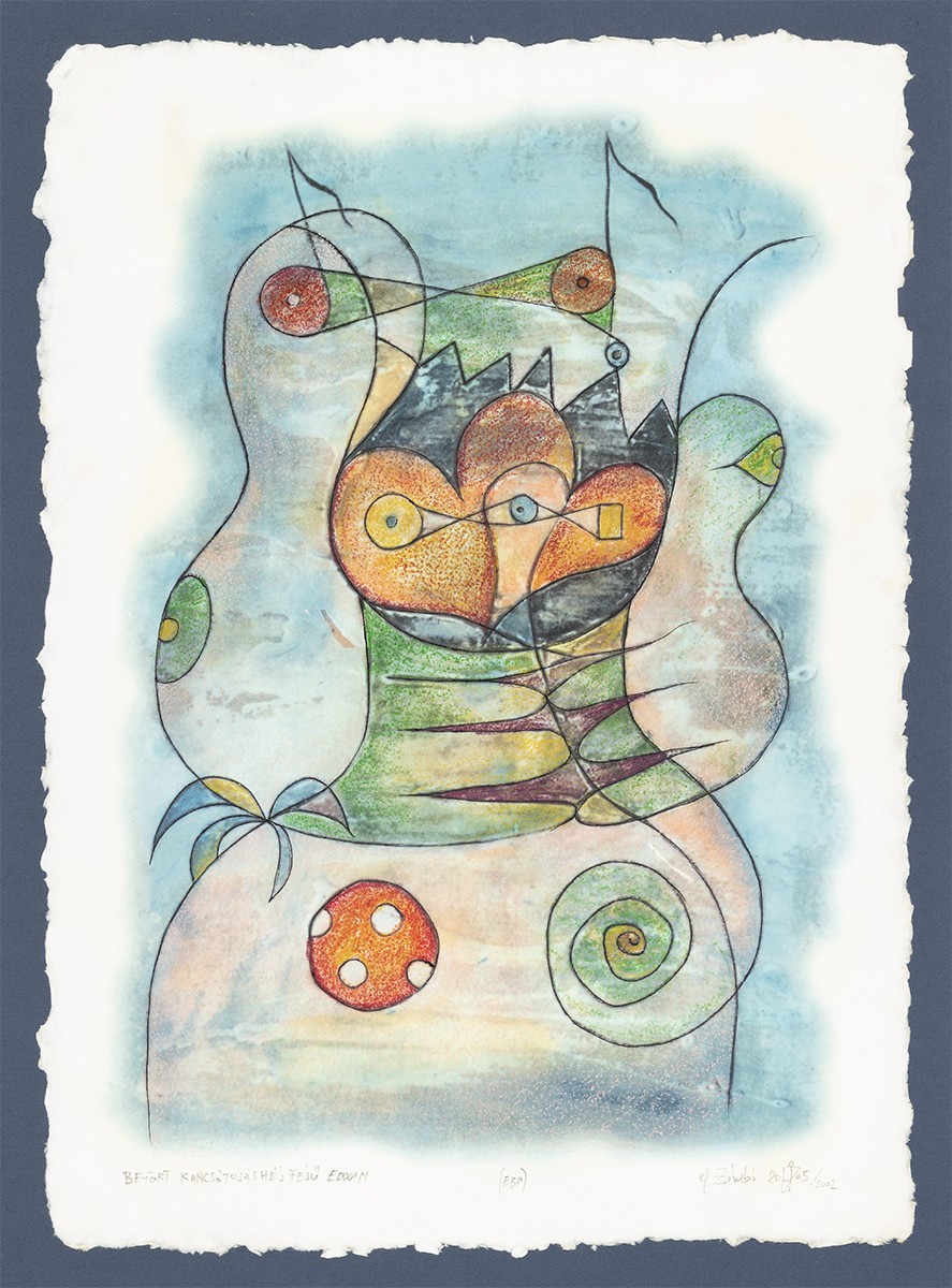 ef. Zámbó István (Salgótarján, 1950) Betört kancsótojáshéjfejű Edwin, 2002 Egyedi beavatkozású print, papír 620 × 450 mm Jelezve balra lent: Betört kancsótojáshéjfejű Edwin Jelezve középen lent: (EBP) Jelezve jobbra lent: efZámbó 2005/2002