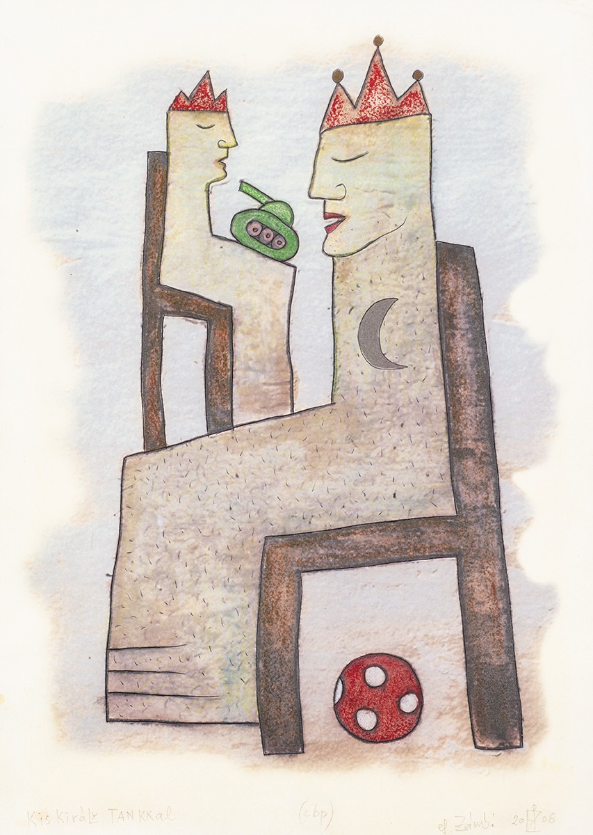 ef. Zámbó István (Salgótarján, 1950) Kis király tankkal, 2006 Egyedi beavatkozású print, merített papír 560 × 400 mm Jelezve balra lent: Kis király tankkal Jelezve középen lent: EBP Jelezve jobbra lent: efZámbó 2006