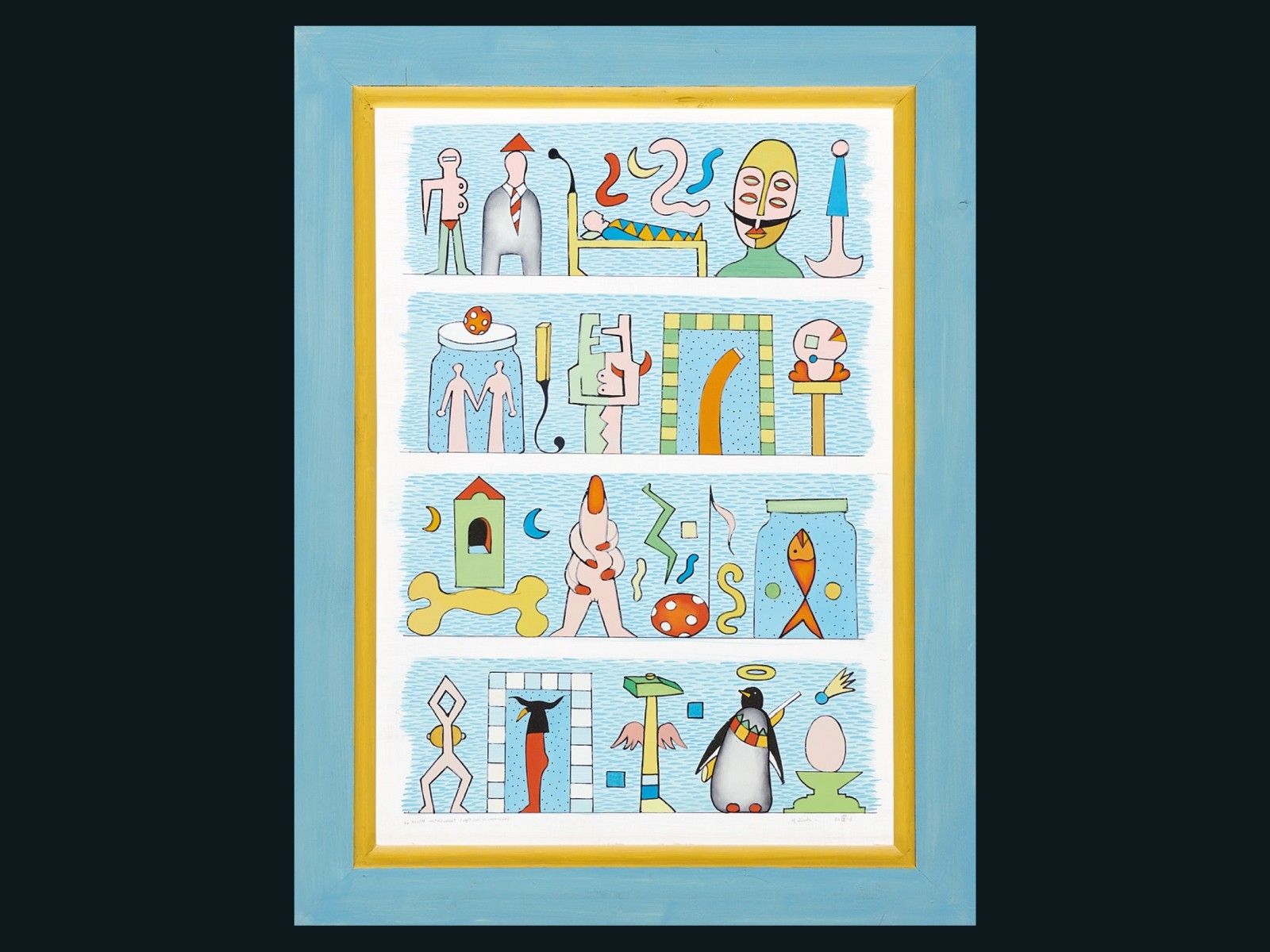 Kikiáltási ár: 110 000 FtKokas Ignác (Vál, 1926 – Vál, 2009) Ady fantázia, 1977 Szeringráfia, papír 610 × 470 mm Jelezve balra lent: Ady fantázia CV/43 Jelezve jobbra lent: Kokas Ignác 1977