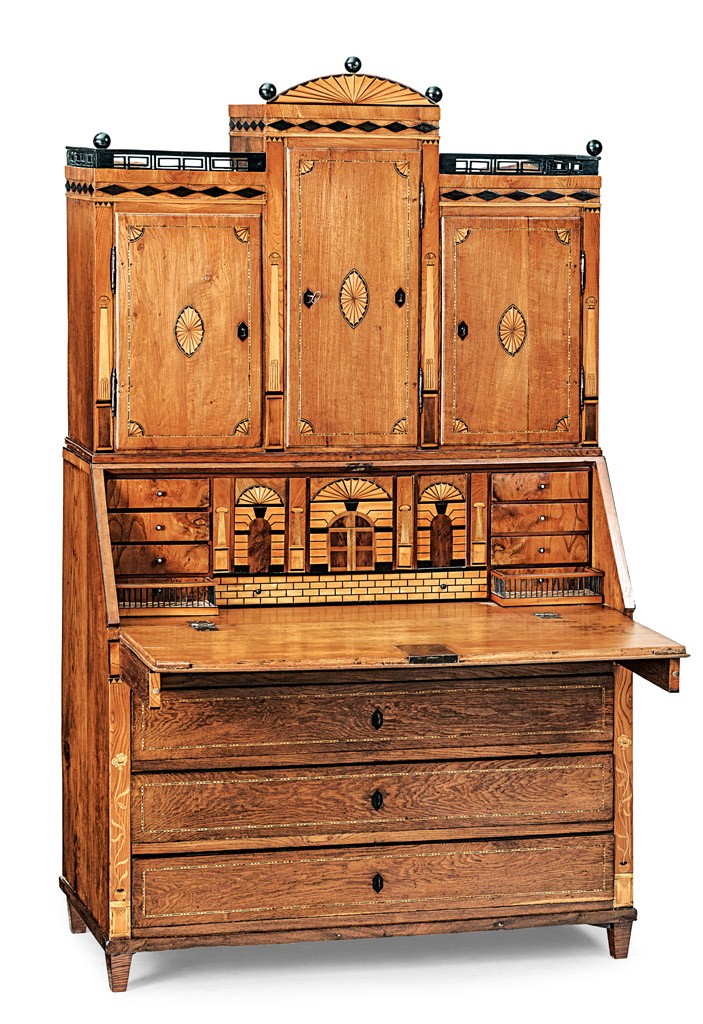 magyar, 1800 körül, tömör tölgyfa, jávor- és ébenfa intarziával,tusfestett díszítéssel, lehajtható írólapja mögött 8 kis és egy nagyobb fiókkal, rekeszekkel, 2 db kulccsal, eredeti zárszerkezetekkel, 208*121*58 cm