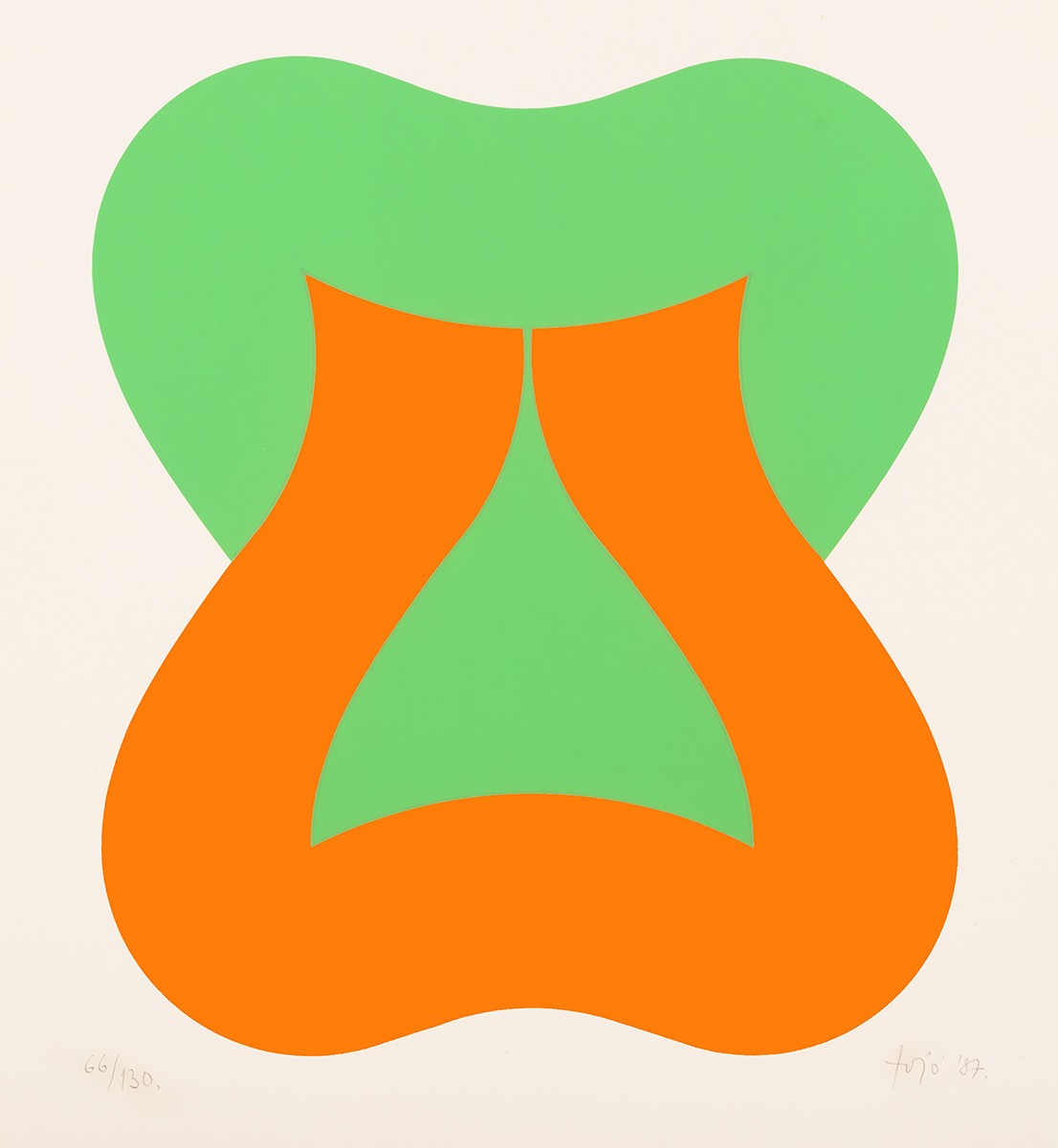 Fajó János (Orosháza, 1937 – Budapest, 2018) Íves forma I., 1987 Szitanyomat, papír 420 × 420 mm Jelezve balra lent: 66/130 Jelezve jobbra lent: Fajó 87