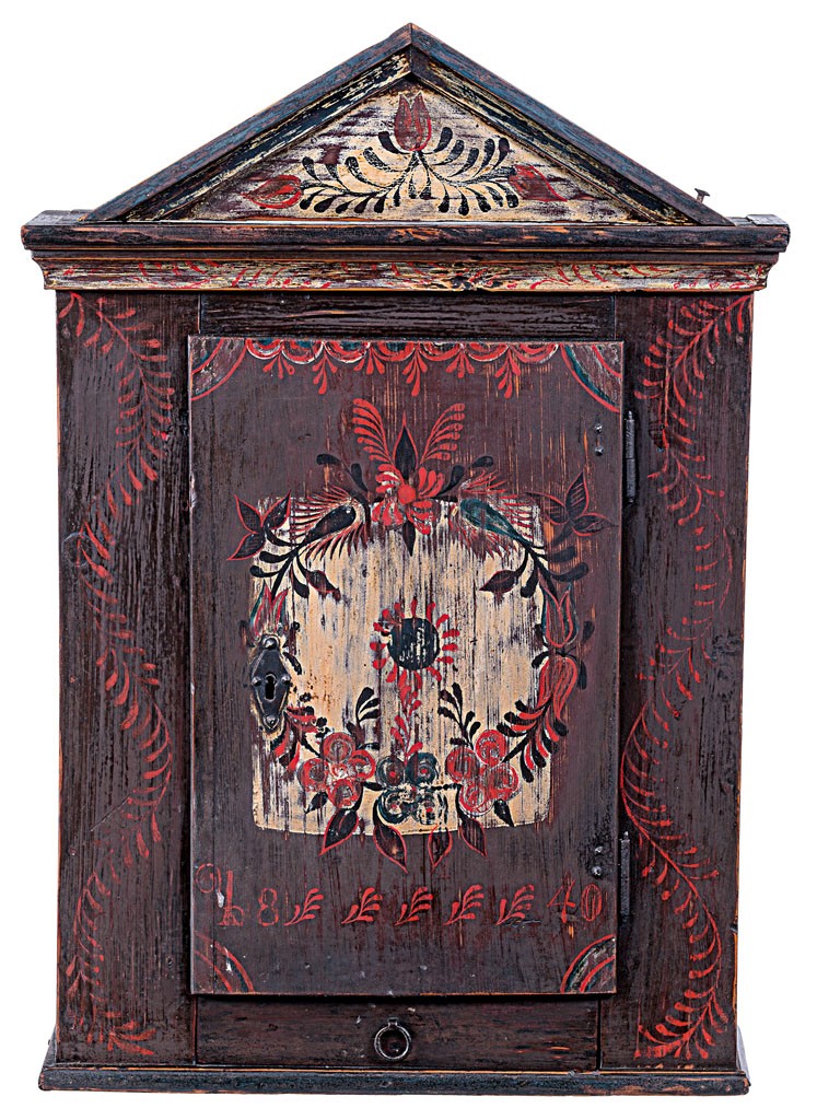 Sárköz (?), 1840, faragott, festett fa, alul egy fiókkal, eredeti zárszerkezettel, kulcs nélkül, 93,5*66*23 cm