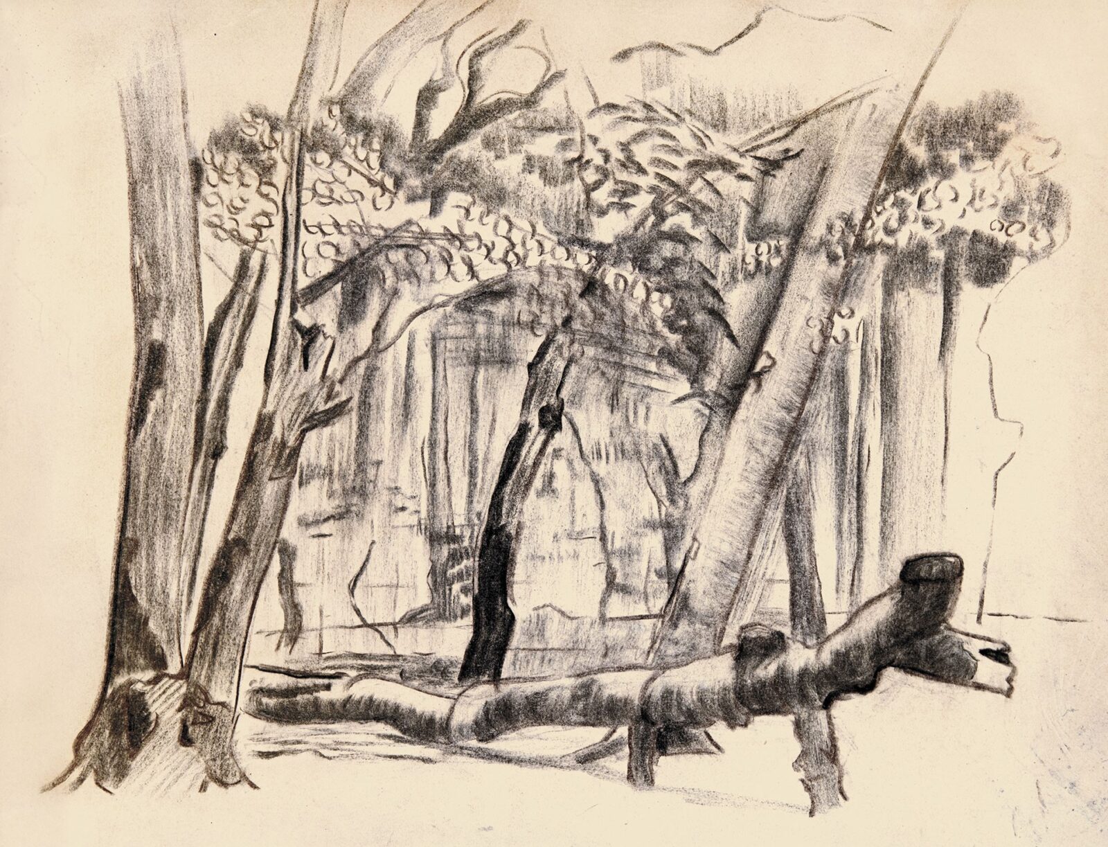 Szén, papír , 40 x 53 cm, Hátoldalon papíron felirat: Igazolom, hogy ezt a rajzot édesapám Farkas István készítette (rajzolta) címe (Sous Bois) Charles Farkas
