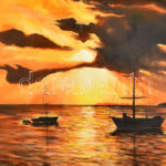 Fehér jelzéssel: Tenger hajókkal. Olaj, vászon. 52×100,5 cm