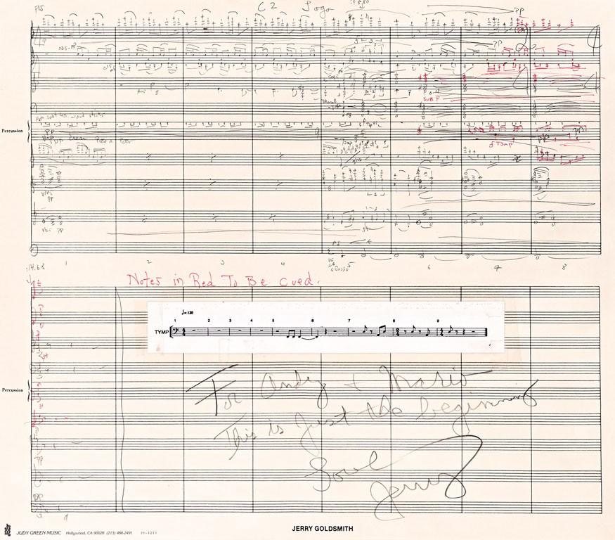 Jerry Goldsmith, feltehetően a "Rambo: First Blood" c. filmhez készült verzió, "For Andy + Mario, This is just the beginning. Love, Jerry" ajánlással, 35*41 cm
