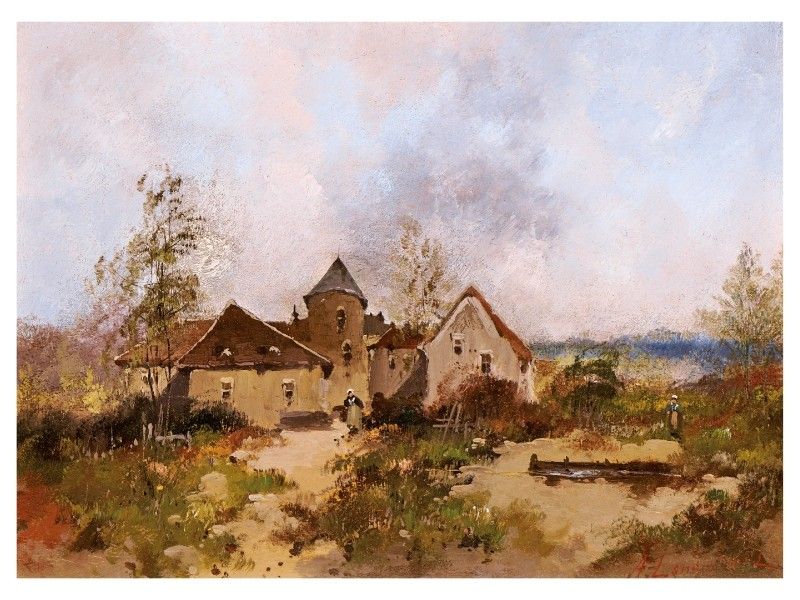 Francia festő 1900 körül Tájkép kastéllyal, két alakkal