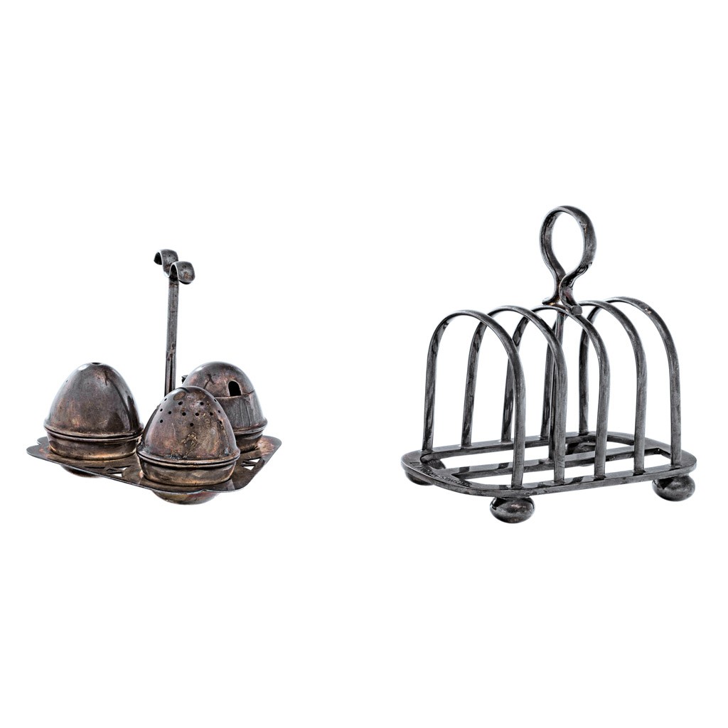 Sheffield, 20. sz. eleje, ezüstözött fém, talpakon: D. LAUDER & SONS LTD. és WH. készítőjel, E.P.N.S. Made in England bélyegző, kiskanál hiány, m: 10-13 cm