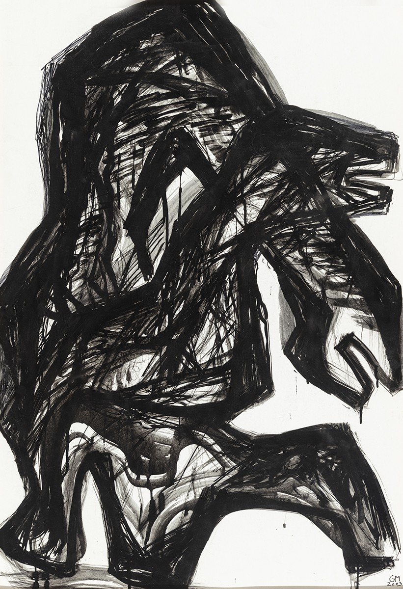 Gádor Magda (Budapest, 1924) Menekülés, 2003 Tus, papír 1000 × 700 mm Jelezve jobbra lent: GM 2003 Reprodukálva: Nagy T. Katalin: Testet öltő kiáltások. Gádor Magda művészete. Körmendi Kiadó, Budapest, 2021. 91. oldal