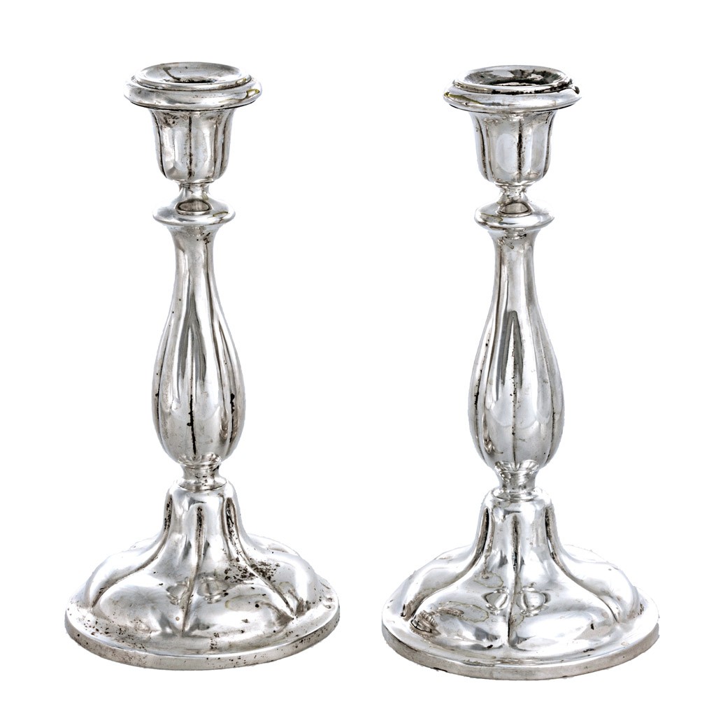 Pest, 1867-1936 közötti fémjellel, 800 ezrelékes ezüst, elkopott mesterjegy, széles, hat gerezdes talpak, baluszteres szárakkal, 560 g; m: 28 cm