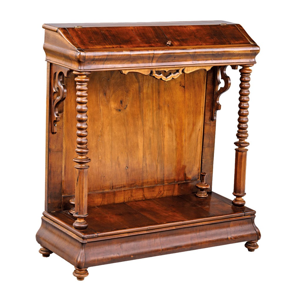 magyar, 19. sz. vége, fenyőfa alapon diófa borítással, esztergált és faragott díszekkel, kihajtható térdeplővel, felfelé nyíló könyöklő alatt rekesszel, 87*81,5*31 cm