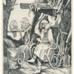 10210. tétel:Michel Fingesten (1884-1943): Ex libris Delage ( morbid, halálos szerelmet imitáló Ex libris a művész saját kezű aláírásával). Opus 1143. (1940 körül) Rézkarc, papír, jelezve jobbra lent, 132x88 mm. A csehországi születésű Michl Finkelstein (1884-1943) grafikusművész 1900-tól a bécsi Kunstakademie-ben tanult, Oskar Kokoschka társaságában. Félbehagyott tanulmányait Münchenben folytatta, majd 1913-tól Berlinben tanulta ki a rézmetszés fortélyait. A Michel Fingesten művésznevet felvevő grafikus az első világháború után a német némafilmes és illusztrátori világban dolgozott. A művészetét betiltó új német rezsim nyomása elől Milánóba költözött, ott fordult érdeklődése a kisgrafikák felé. Ex librisként feliratozott grafikái számos esetben a képzeletbeli megrendelő tulajdonságait növelik szürreális, művészi látomássá. Rézkarcunk ezúttal viszont feltehetően valós megrendelő, Albert Delage francia könyvgyűjtő számára készült. A morbid, szürreális grafika középpontjában földbe ásott, tövisekkel körbevett női fejet csókoló férfi arc kontúrjai sejlenek fel, a csókjelenet körül kaján örömmel vigyorgó emberi koponya, alul androgün, haláli harsonások veszik körbe az Ex libris feliratot, felül pedig Paul Verlaine francia költő korai verséből való idézet. A grafika alatt Michel Fingesten saját kezű aláírása. Tökéletes állapotú lap, paszpartuban, fakeretben, üveglap mögött.