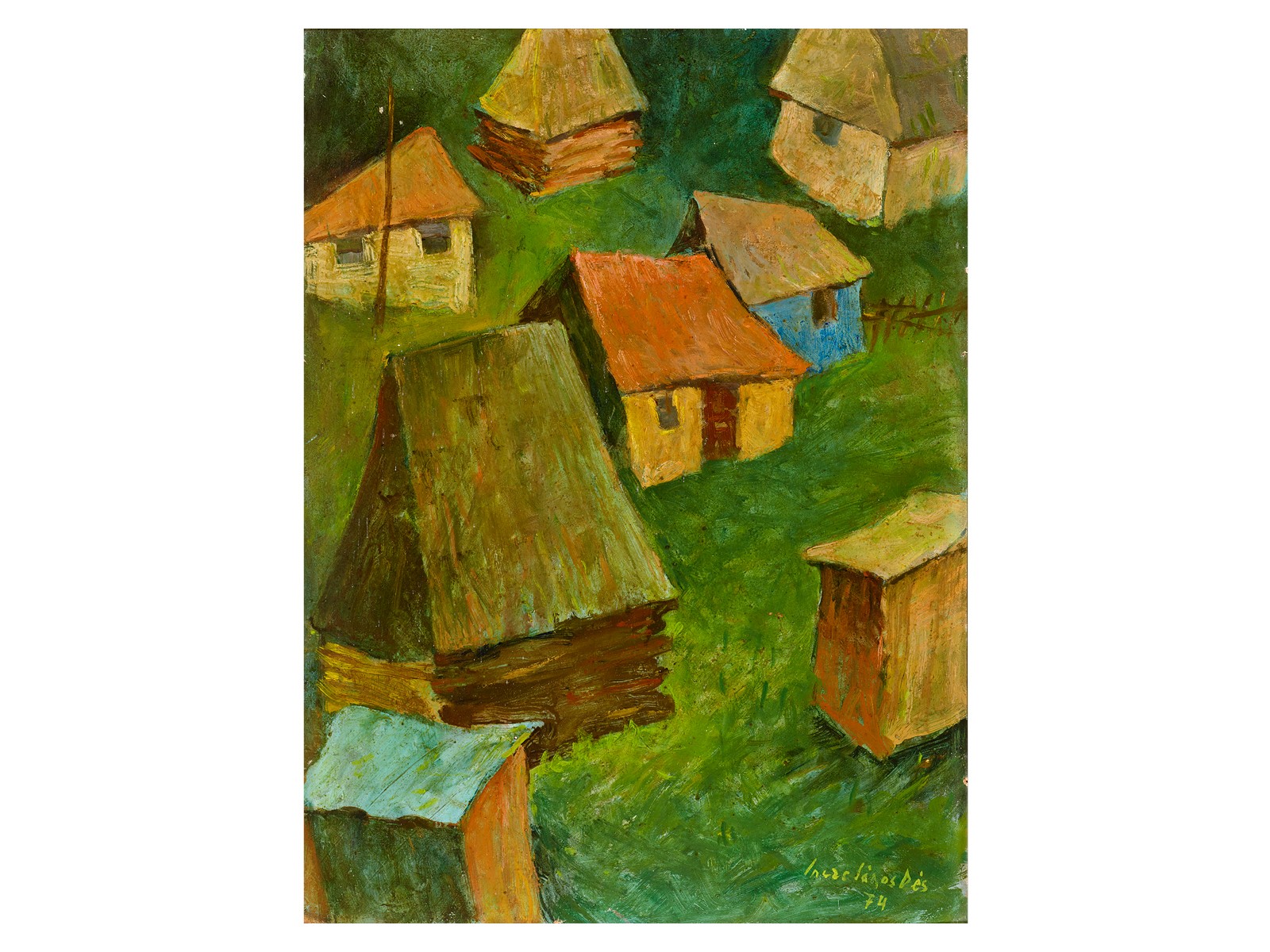 Incze János (Szinérváralja, 1909 – Dés, 1999) Házak, 1974 Olaj, farost 49 × 36 cm Jelezve jobbra lent: Incze János Dés 74