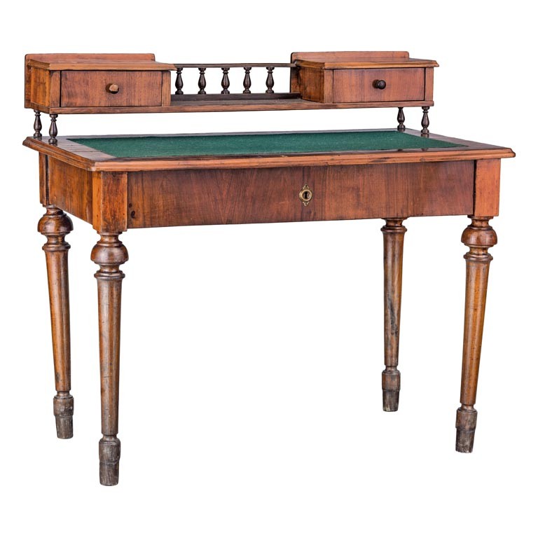 magyar, 1900 körül, fenyőfa alapon diófa borítással, esztergált lábakkal, zöld posztós írólappal, felépítményében két kis fiókkal, sérült, 101*109*62,5 cm