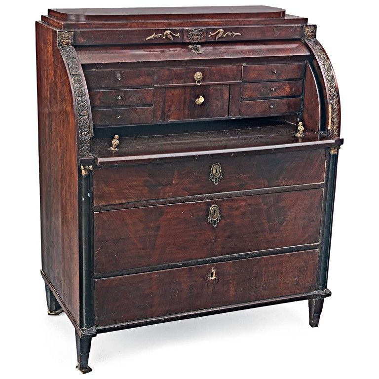 magyar, 19. sz. második fele, fenyőfa alapon diófa borítással, bronz veretekkel, felhajtható lapja mögött 7 fiókkal és egy rekesszel, hátoldala pótlás, sérült,, 128*107*62 cm