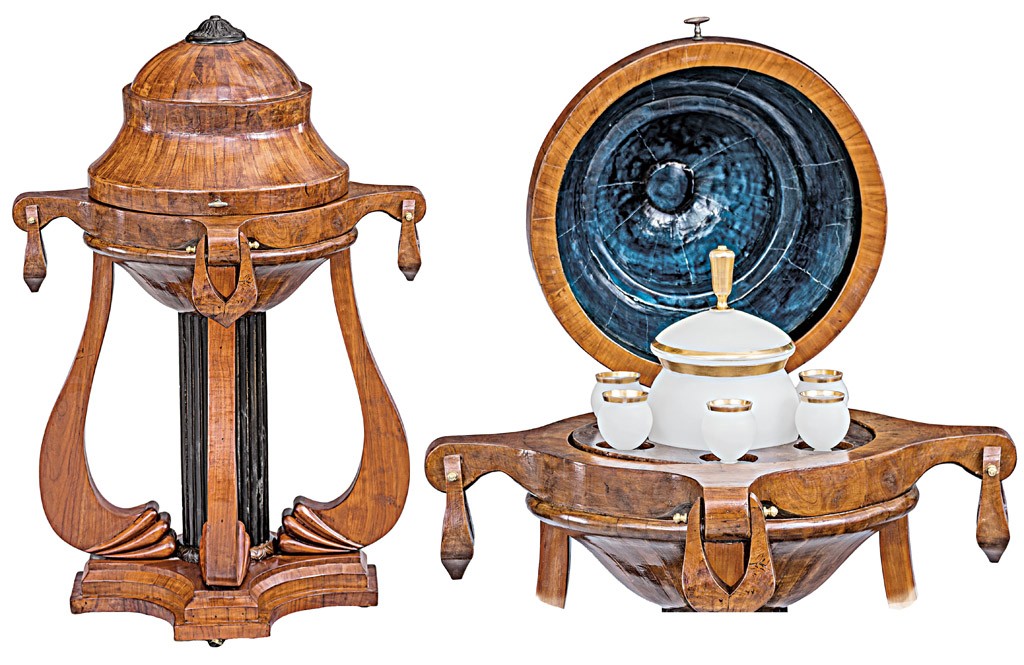 Bécs, 19. sz. második fele, fenyőfa alapon diófa borítással, faragott záródísszel, belsejében kiemelhető pohár- és palacktartóval, jelezve a belsejében: "Gotlieb & Rohle in Wien", bronz szerelékkel, görgőkkel, a bólés készlet pótlás, felújított, m: 114 cm
