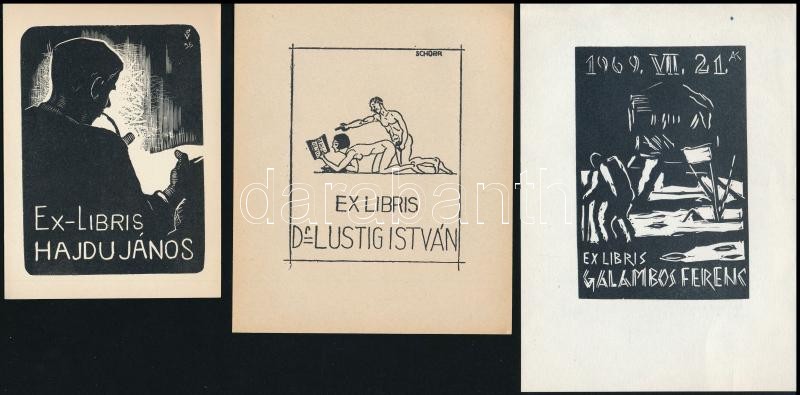 Jelzés nélkül: Art deco ex libris (Mme de Tournandre). Színes klisé, papír, 10×6 cm, Jelzés nélkül: Galambos Ferenz. Fametszet, papír, 8×7,5cm, Varsányi Pál: Hajdu János. Fametszet, papír, 9×6,5cm, Olvashatatlan jelzéssel: Galambos