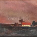 Jelzés nélkül, feltehetően XX. sz. közepén működött alföldi festő: Tanya naplementében. Olaj, karton. Javított. Kissé sérült. Dekoratív fakeretben. 70×96 cm. KIZÁRÓLAG SZEMÉLYES ÁTVÉTEL, NEM POSTÁZZUK! / ONLY PERSONAL COLLECTION AT OUR OFFICE.<a hre