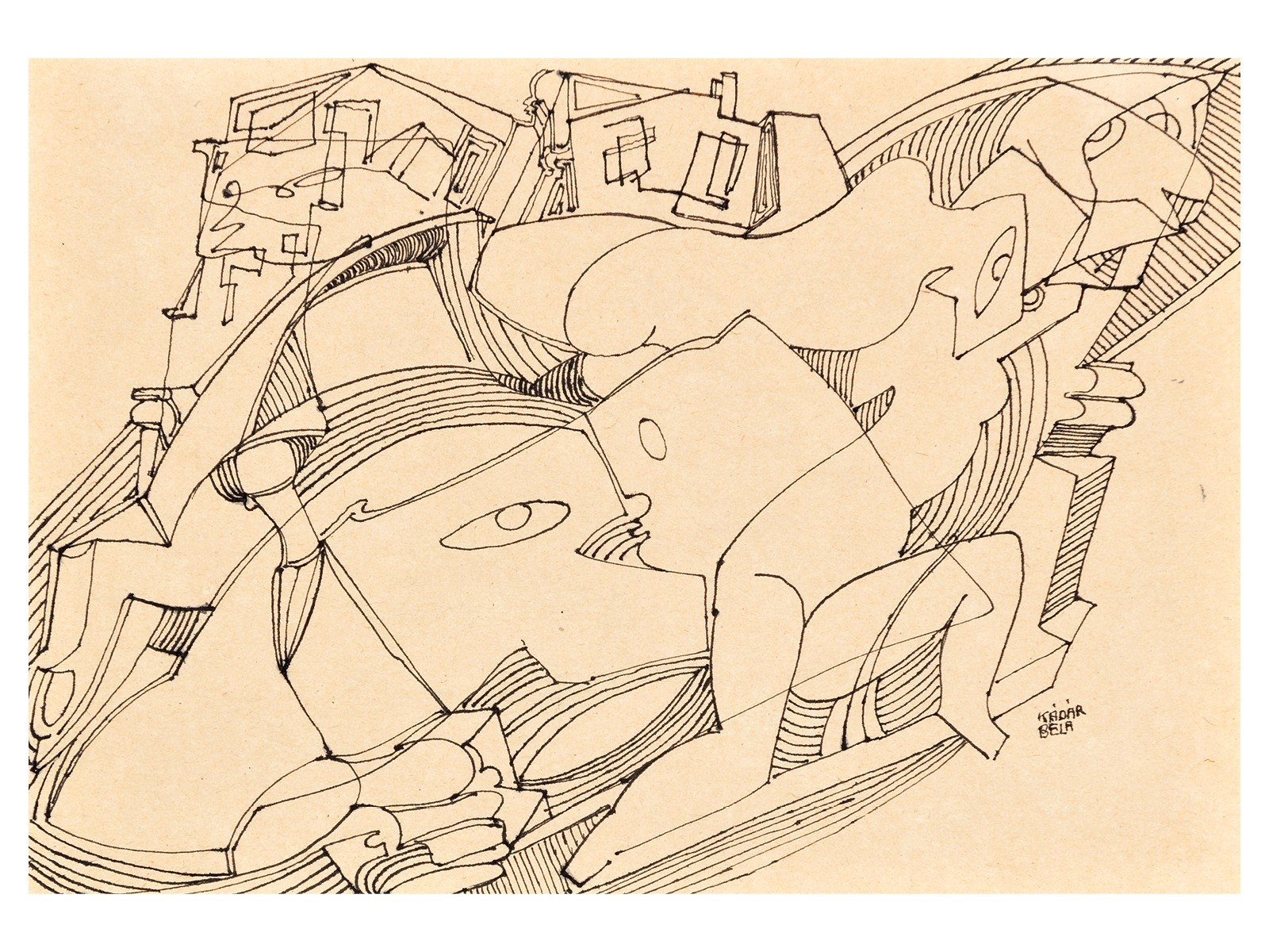 Kádár Béla (Budapest, 1877 – Budapest, 1956) Absztrakt kompozíció, 1928 körül Tus, papír 21,5 × 30,5 cm Jelezve jobbra lent: Kádár Béla Proveniencia: egykor Bedő Rudolf gyűjteményében Kiállítva és reprodukálva: Kádár Béla – A modern magyar rajzművészet me