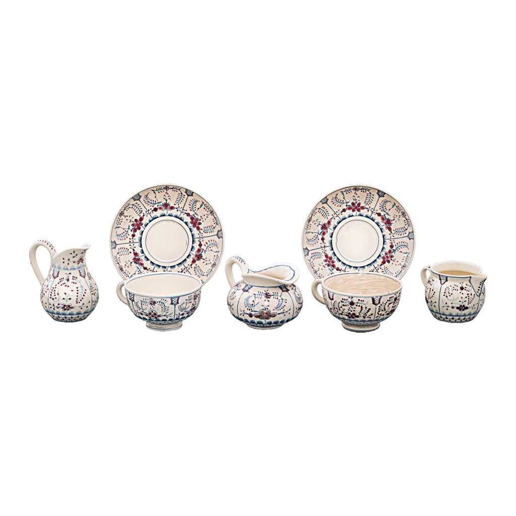 Zsolnay gyár, Pécs, 1880 körül, festett, mázas porcelánfajansz halszálka dekorral, talpakon TJM családi bélyegzőkkel és 1 db csészén öttemplom jelzettel, apró csorbulással, össz.: 7 db, d: 16,6 cm; m: 6,5-11 cm