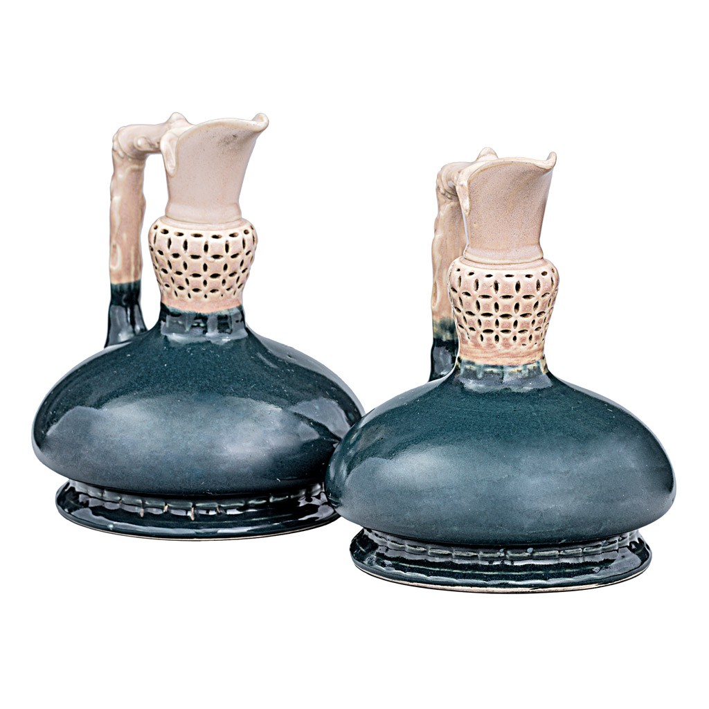 Zsolnay gyár, Pécs,1880 körül, festett fehércserép, az egyik jelezve az alján: masszába nyomott "Zsolnay Pécs" jel, formaszám:4752, m: 18 cm, kis sérülésekkel
