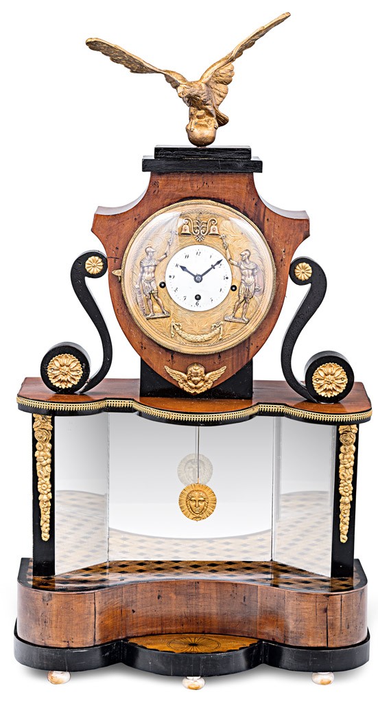 Bécs, 1840 körül, negyedütős, automata szerkezet, fekete lakkfestett és diófa borítású, tusfestett tokban, aranyozott sárgaréz veretekkel, cizellált bronz és zománcozott számlappal, ingával, működőképes, 72*36,5*16 cm