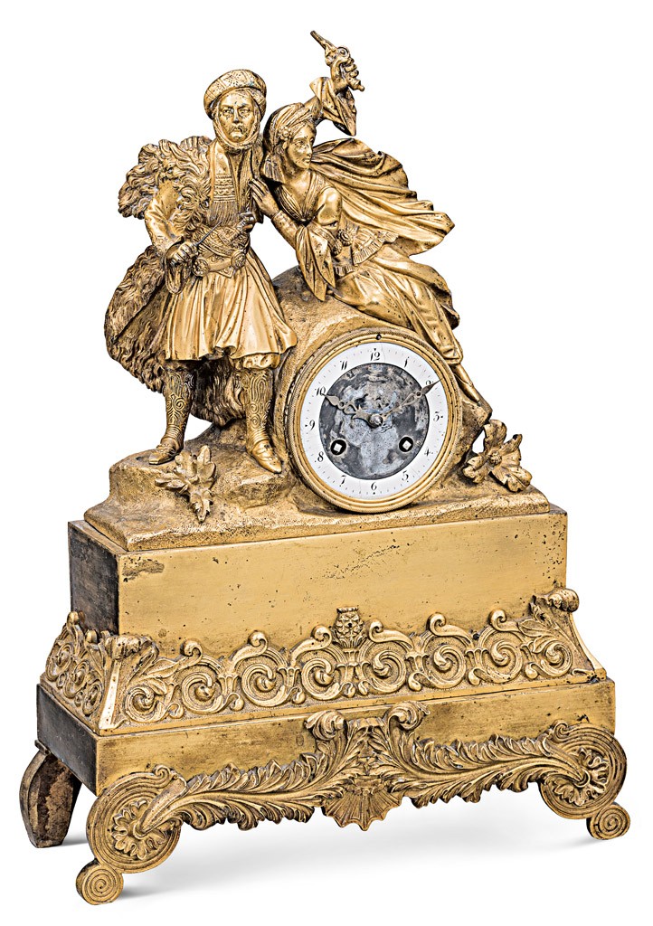 francia, 19. sz. közepe, felesütős szerkezettel, aranyozott bronz tok, felhúzókulccsal, m: 41 cm