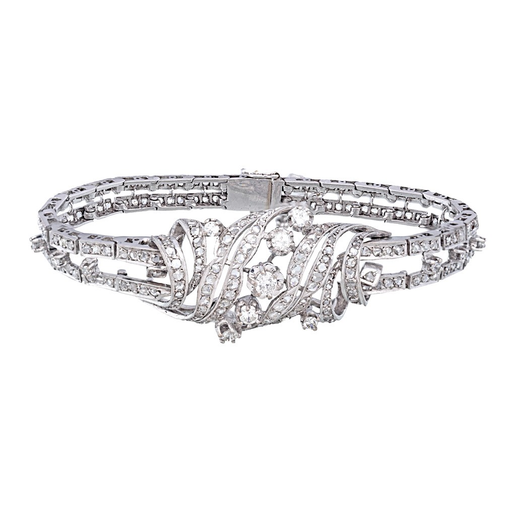 20. sz., 2016 utáni budapesti fémjellel, 14 k ródiumozott fehérarany, áttört középdíszben karmos foglalatban 7 db briliáns cca. 0,5 ct (M1-M2, W-TCr, VS-SI2), 6 db achtkant gyémánt és, 172 db régi csiszolású gyémánt, kis sérüléssel, 2 db kő hiánnyal, nyel