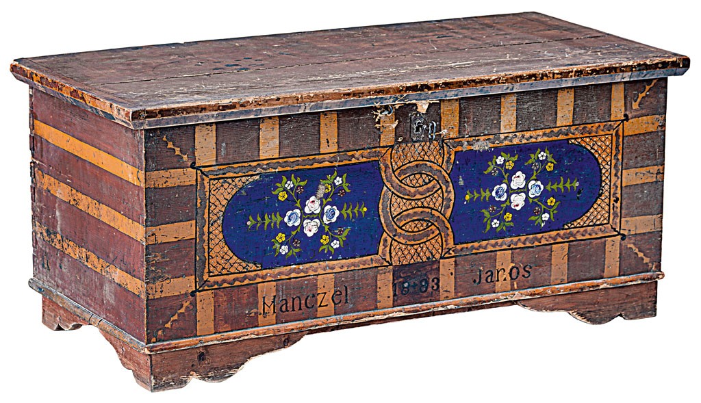 Dunántúl, 1883, festett, faragott fenyőfa, "Manczel János 1883" felirattal, eredeti zárszerkezettel, ládafia hiányzik, 54*123*58,5 cm