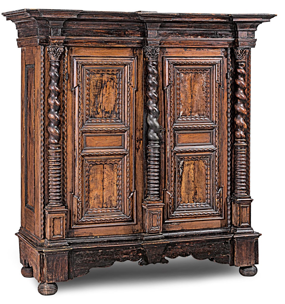 német, 18. sz., tömör diófa, faragott és esztergált díszítéssel, eredeti zárszerkezettel, sérült, kulcs pótolt, 196*173,5*69 cm